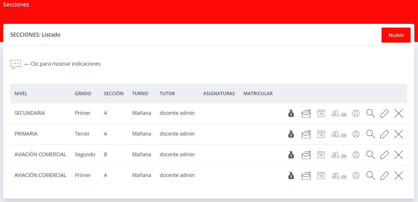 Cree diferentes Secciones de sus cursos/programas donde serán matriculados los alumnos. Una vez que el alumno es matriculado, la aplicación creará sus obligaciones de pago de acuerdo a la escala de pensiones y a la fecha de vencimiento definida.